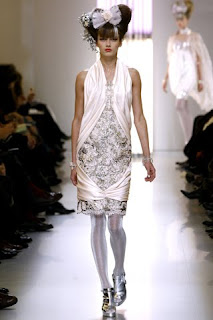 Des coloris pastels, beaucoup d'argent, une collection tout en romantisme, volume et délicatesse. Les broderies apparaissent comme une multitude d'éclats de métal, donnant cette singularité futuriste, comme si Karl Lagerfeld nous racontait sa vision d'une ère qui n'aurait pas connu la Haute Couture.